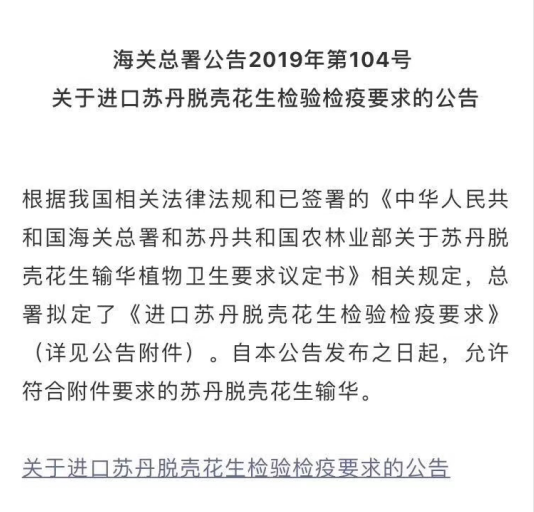 海關(guān)總署公告2019年第104號(關(guān)于進口蘇丹脫殼花生檢驗檢疫要求的公告)